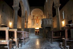 07Nov 0 Romanesque Parish Church S. Giorgio in Brancoli Posted By: Anna Maria Baldini 40 Top Sights of Tuscany, Abbeys and Churches of Tuscany, History and Culture of Tuscany, Tuscany travel guide Pieve di San Giorgio a BràncoliThe Parish Church of St. George at Bràncoli, in Lucca Province, Tuscany. The carved Ambon of the Parish Church of San Giorgio at Bràncoli The ancient Pieve at Brancoli is one of the most atmospheric mediaeval structures in a Region, Tuscany, that contains a great many of them, and is well worth a visit if you are exploring the environs of Lucca. The Brancoleria, where the church is situated, stretches between the valley and the slopes of Mount Pizzorne, upstream on the Serchio river, approximately 10 km from Lucca. The earliest church on the site was was built on the ruins of a pagan temple dedicated to the god Apollo in the early Middle Ages. The first known documentation of the church is a manuscript dating from 767, preserved in the Archbishops’ Archives in Lucca. In the manuscript, one Ausolo di Brancoli bequeaths all his assets to the church or monastery of San Giorgio in Generiano. Another document mentions the church as dependent on the parish of Sesto from the year 772. and the first mention of the church as an independent parish dates back to 1092. It was in the second half of the 11 C that the entire area of the Brancoleria experienced a dramatic growth in population. The activity of Bishop Anselmo da Baggio, who later became Pope Alexander II, and the financial support of Matilde di Canossa led to the construction of the church as it is today. Construction coincided with the massive expansion in the number of parish churches that occurred during the late 11 C and early 12 C, resulting in a number of Romanesque architectural masterpieces, of which the Pieve di San Giorgio is one. Both the exteriors and the carvings inside this masterpiece of Romanesque art survive intact, providing a typical example of high mediaeval austerity. The crenelated bell tower is also pure Romanesque, pierced with single and double lancet windows. The entire edifice is composed of square marble blocks. The massive bell tower is in the style of Lucca and partially covers the facade. Pieve di San Giorgio a Bràncoli main entry Pieve di San Giorgio a Bràncoli apse Inside, the church has three basilican naves articulated on five bays, the transept is absent and the presbytery is slightly raised and still divided by a partition, a fence that in the Middle Ages divided the priests from the faithful. A semicircular apse ends the church. The columns and pillars are surmounted by capitals with phytomorphic decorations of a classical imprint and support round arches. The roof is made of wooden trusses in all three naves. Small single-lancet windows illuminate the church at the level of the side walls and in the cleristory, above the arches. The 12 C octagonal baptismal font, in the left aisle, is signed “Guidi”, a Lombard-Lucca master, and is decorated with plant motifs and heads. The presence of a carved fruit at each edge is unique. The most important sculptural piece is however the Ambo, dated 1194 and the work of the master Guidetto. It has a quadrangular plan, with Corinthian columns that support it, two of which rest on as sculpted lions. In addition, there are two sculptures dating back to the 11 C: the altar with six columns and a human figure in the centre and the holy water stoup with plant decorations and zoomorphic protomes. The latter bore the signature of the sculptor, “Raitus”, and was unfortunately stolen in June 2000. On the right wall, there is a 15 C glazed terracotta work attributed to Andrea della Robbia depicting St. George, the dragon and the princess. Above the altar, there is a painted cross of the Lucca school of the 13 C and a fresco of an Annunciation dating from the end of the 14 C by Giuliano di Simone is located at the end of the left aisle. The tabernacle at the head of the right aisle, in stone, is Renaissance. The sacristy preserves a processional cross from the 16 C. Pieve di San Giorgio a Bràncoli interior Parish Church of San Giorgio at Bràncoli interior More about the Basilicas, Pievi, Abbeys, Monasteries and Hermitages of Tuscany. Here are some similar topics: Lucca The city of Lucca is located in western Tuscany and should at the very least be included in any tour of Tuscany. Lucca also makes an excellent base for your stay in Tuscany. The city is flat, compact and relatively… Read More » San Donato in Poggio San Donato in Poggio is a mediaeval village of great charm located near the Via Cassia, the highway that runs along the western boundary of the Chianti Classico wine zone from Florence to Sienna. In modern times, the Via Cassia… Read More » San Gimignano San Gimignano is famous for its Tuscan tower houses. These were a common sight in Tuscan towns during the late middle ages but most city rulers ordered them to be torn down as a measure to reduce intramural discord. … Read More » Vinci, birthplace of Leonardo da Vinci Vinci is located in northern of Tuscany near Florence, on the slopes of Montalbano, an area of classic Tuscan hills carpeted in vineyards and olive groves on terraces supported by dry stone walls. Top view, suggests a boat with two… Read More » Pisa Pisa is a city of unique and to some extent under-rated beauty. Pisa is of course one of the most famous towns in the Region of Tuscany. Many tourists arrive at Pisa airport en route for Florence and neglect to… Read More »